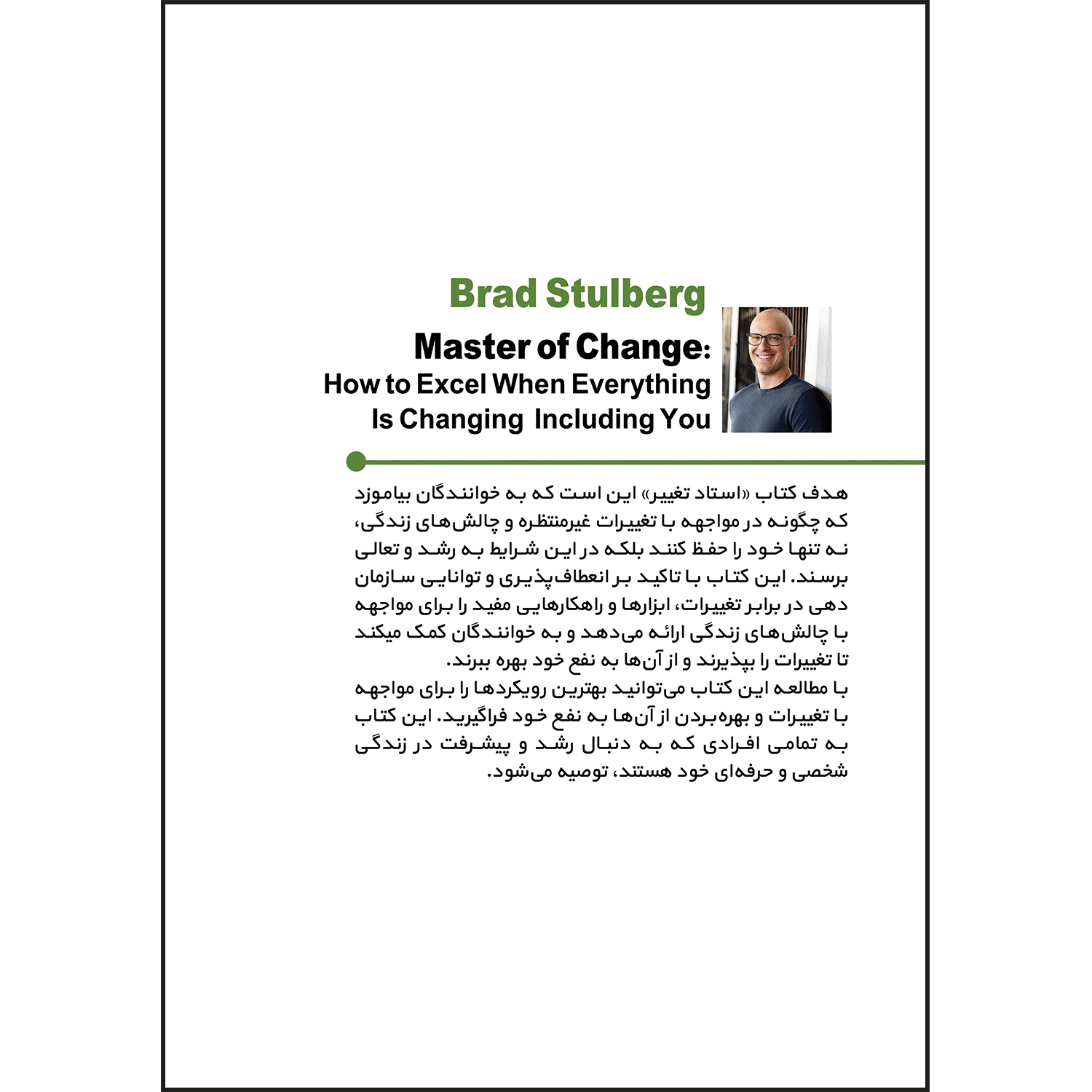 کتاب استاد تغییر اثر برد استولبرگ ترجمه مهدی رضائی انتشارات بله: کتاب «استاد تغییر» نوشته برد استولبرگ، راهنمایی جامع و عملی برای خوانندگانی است که در پی موفقیت و پایداری در دنیایی هستند که به طور مداوم در حال تغییر است. هدف اصلی کتاب این است که به خوانندگان بیاموزد چگونه در مواجهه با تغییرات غیرمنتظره و چالشهای زندگی، نه تنها خود را حفظ کنند بلکه در این شرایط به رشد و تعالی برسند. استولبرگ با بهرهگیری از تحقیقات علمی و تجارب شخصی، اصول و راهکارهایی را ارائه میدهد که به خوانندگان کمک میکند تا تغییرات را بپذیرند و از آنها به نفع خود استفاده کنند.
