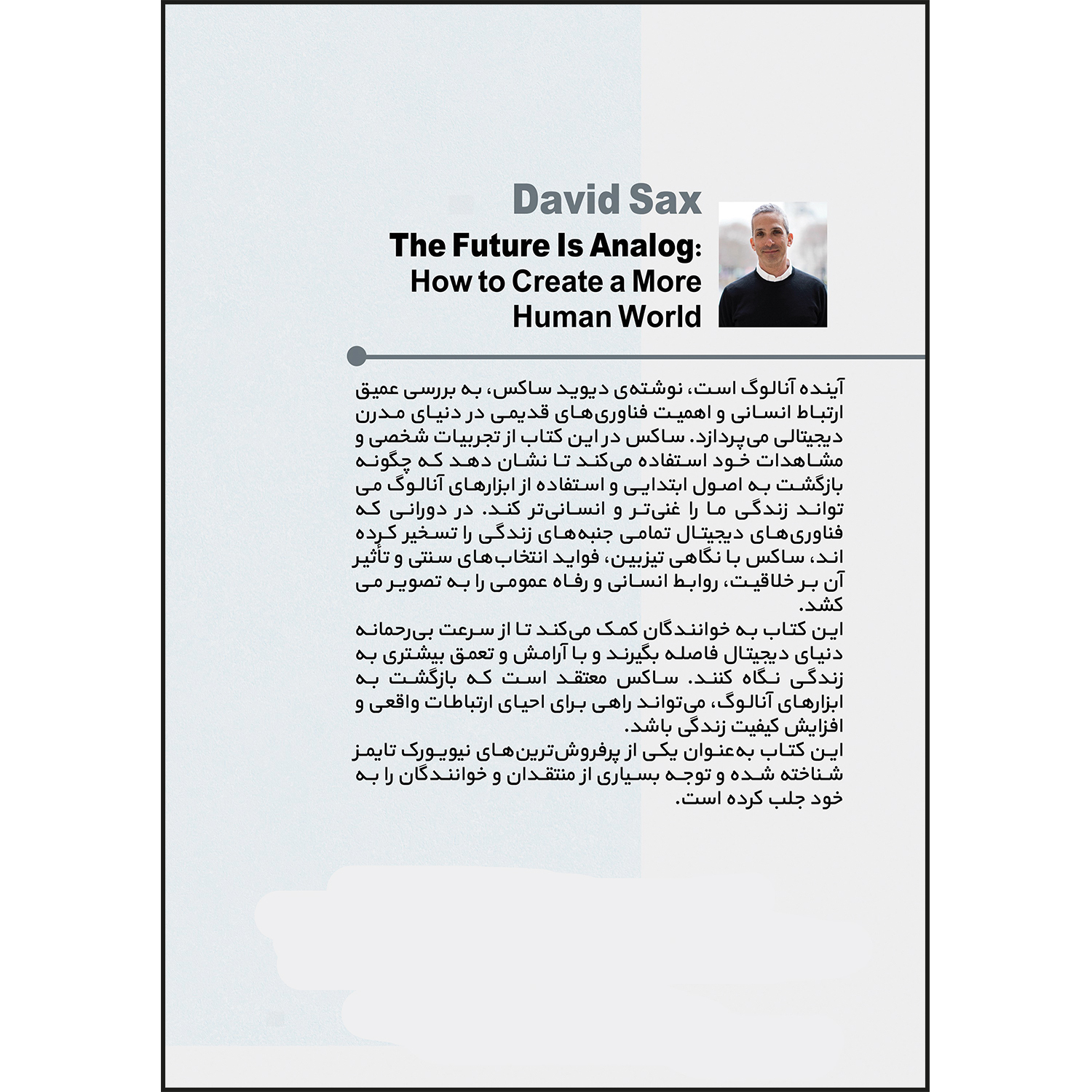 کتاب آینده آنالوگ است اثر دیوید ساکس ترجمه محمد قدم پور مقدم انتشارات بله: کتاب “آینده آنالوگ است: بازگشت به چیزهای واقعی در عصر دیجیتال” (The Revenge of Analog: Real Things and Why They Matter) نوشته دیوید ساکس، روزنامهنگار و نویسنده، یک بررسی جذاب از پدیده بازگشت به فناوریها و محصولات آنالوگ در دنیای دیجیتال است. ساکس در این کتاب نشان میدهد که چگونه در عصری که همه چیز به سمت دیجیتالی شدن پیش میرود، مردم به طور فزایندهای به سمت تجربههای ملموس و فیزیکی روی آوردهاند.